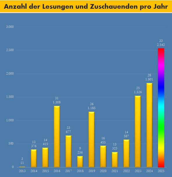 Während ich die spannendsten Passagen meines Buches vorlese, erwecken Bilder, Videos, Geräusche und eigens komponierte Musik die Welt der Geschichte zum Leben und schaffen eine mitreißende Atmosphäre.